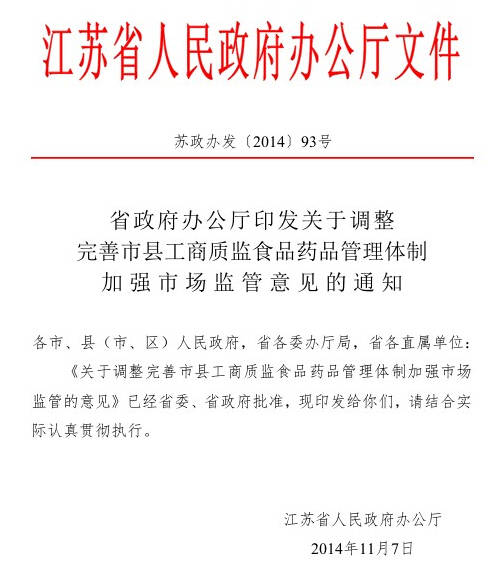 ! i$ r; X( t. {近日,江苏省人民政府办公厅发布文件苏政办发〔2014〕93号《江苏省政府办公厅印发关于调整完善市县工商质监食品药品管理体制加强市场监管意见的通知》。《意见》全文如下: