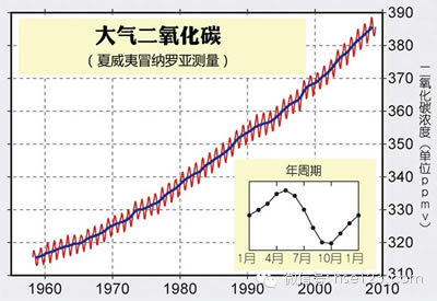 0 e4 |( ]- L$ F4 m! o8 W& b) l9 }% S根据夏威夷冒纳罗亚天文台发布的二氧化碳数据绘制的1958年至2010年二氧化碳浓度曲线,数据表明二氧化碳浓度按月份有规律性地起伏,从数年内来看总体趋势是不断升高。 来源:维基共享数据