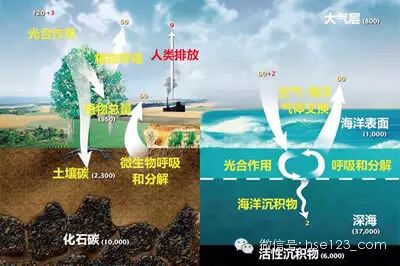 # s. O" \/ s7 \4 g碳在地球上的循环过程 从碳在地球上的循环过程来看,森林、土壤、海洋均具备大储量的碳汇能力。图中数据的单位为10亿吨/年。来源:NASA网站; M) J9 h$ `9 d/ T