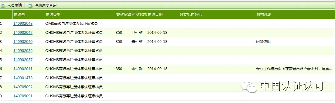 关于3.0系统,还真是令许多审核员头大。小编综合了微信公众平台的各路留言,精心总结,并请专家一一解答,让您轻松搞定3.0系统注册。 1. 降级注册的功能与操作(我在群里看到其他机构的提到的问题,好像说降级申请还不能操作) 答:申请降低注册级别目前需要提交申请材料说明原因,经人员注册部负责人确认,修改注册系统数据信息后方可提交申请。 2.有些申请项目还没加进去,比如说QMS建工领域申请 答:目前该领域注册系统正在调整,预计12月中旬开通。 3.3.0系统设计的本意是申请人资格到期前提交再注册申请,提交申请过程中,如果中断,下次再进入系统中,还会在上次退出系统的状态上继续补充、完善申请,但是我们审核员遇到了,每登陆一次系统进行OHSAS 再注册,都会产生一个新的注册号,很困扰: 如图,针对一个OHSAS,提交了8次申请,且管理员将申请退回后,申请人再登陆进行修改,又出现一个申请号;(这个倒仅仅是个别人的问题) 答:申请人未使用IE浏览器或IE浏览器未按用户手册进行设置,导致申请时出现重复的申请数据。 4.协会对于不符合项整改的时间,有没有规定?我们目前操作的不符合整改申请,一般都在3个工作日左右,协会就可以关闭完成,但是我有两个境外转换注册申请,9月18号开始进入CCAA关闭不符合状态,再没有更新,不知道怎么回事; 答:不符合项整改的流程是:协会开具不符合报告发送至申请人----申请人完成整改提交推荐机构------推荐机构审核后提交协会审查批准。不符合整改提交到协会,经审查符合要求的注册申请一般情况下不超过5个工作日即可报批准岗批准。 5.协会发布3.0系统的时候表示,将来年度确认的功能也会在系统上加入,由审核员登陆系统完成年度确认,请问,年度确认模块大概什么时间可以加入? 答:3.0系统年度确认模块正在开发,预计明年1季度投入使用。