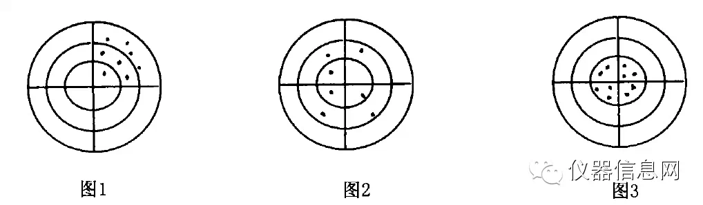 ! D! s4 X$ M; F' Q2 L K 为了更好地说明测量的精密度、测量的准确度和测量的精确度三者之间的联系和不同,下面我们用打靶时弹着点的情况为例说明。图1 表示射击的精密度高,好比测量数据精密度高, 但准确度较差;图2 表示射击的准确度高, 好比测量数据的准确度高, 但精密度差;图3 表示精密度和准确度均较好,好比测量数据的精密度和准确度都好, 即精确度高。