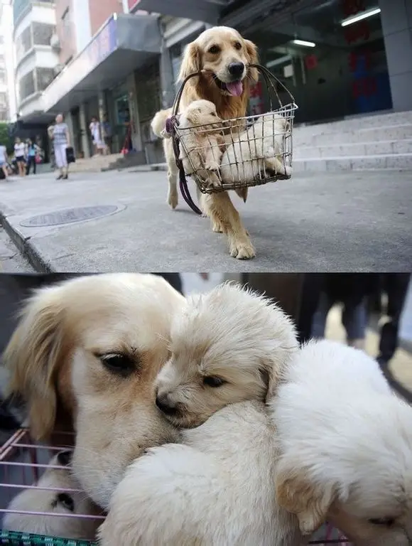 26.2010年8月18,深圳,金毛犬贝贝按主人要求,叼着自己的三个孩子去卖。贝贝特别懂事,主人去买菜,它蹲在旁边等,等菜放在篮子里,它就帮主人叼回家,还会在下雨时帮主人叼伞,会把垃圾摆在门口,只要主人一声招呼,就把它们叼到垃圾筒里。贝贝知道要去卖孩子,这不是第一次了。路上,3只毛茸茸的金毛宝宝在篮子里打瞌睡,能叼27斤的贝贝几次停下来,在狗市,面对讨价还价的人,贝贝知道又要和孩子分离了…