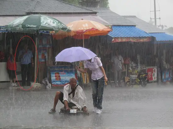 18.【女孩暴雨中为残疾乞丐撑伞,制服男正在一旁观望】