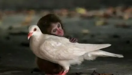 16.一只与妈妈走失的小猴子,对这个世界既充满了恐惧,又满怀着希望,它深情地拥着白鸽,体验着这个世界;白鸽没有害怕和抗拒,它用接纳回应着这只孤独的小猴子。爱无疆,谁说过爱只存在于人类?