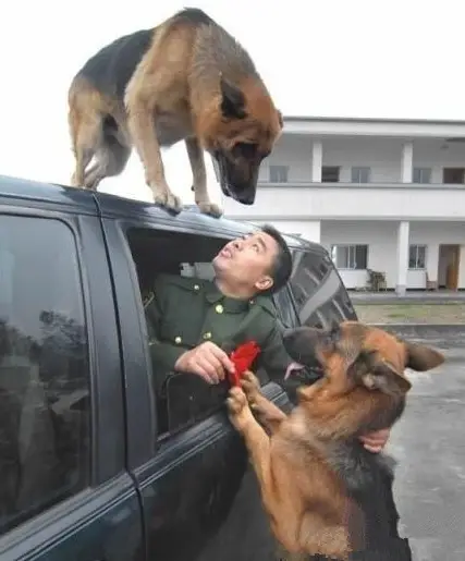 11.这个叫小鲁的战士退伍走的那一天,他一直训练的警犬“待发”和“大海”一直拉扯他的行李,不让他走。好容易坐上车了,“待发”突然蹿上车顶,“大海”扑车窗狂叫,车只好停下来,连司机都哭了