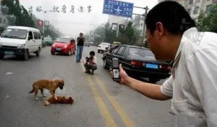13.这组图片曾在网上很风行,一条小狗受了伤,另一条狗一边护住它,一边向人类求助,现场很多人驻足围观,感叹、拍照、上传上网,展示狗们互助友爱的精神。此事被日本媒体转载后引起了日本社会普遍的愤怒和嘲骂,认为在场中国人缺乏同情心,没有爱心……网络为此展开调查,大约七成网民接受批评。