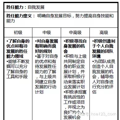 关注hse123_com,每日分享各行业健康安全环保知识。为了您的企业安全、家庭幸福和社会和谐,让我们一起做HSE知识的传播使者,努力改善企业安全管理、营造社会安全氛围、提高全民安全素养。 1、岗位HSE说明书中的“能力要求”旨在强调需要承担特定职责所需要的最低HSE能力要求——即“能不能做”。 模板如下: 2、岗位HSE说明书中的“胜任能力”模型旨在强调可以达成更好绩效的能力条件——即“能不能做好”健康安全环保小助手 公众号:hse123_com。 模板如下: 来源:健康安全环保小助手(转载请注明出处)