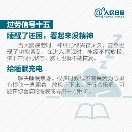 [size=1em]是不是常觉得眼睛发酸干涩、记忆力下降、记不住事、反应变迟钝、决策力下降……?其实这都是过劳的信号!据统计,30岁至50岁英年早逝的人群中,95.7%的人死于因过度疲劳引起的致命疾病。15个你必须知道的过劳信号,自测一下,别让勤劳变过劳!/ h9 N; }4 l. W4 I; s* h