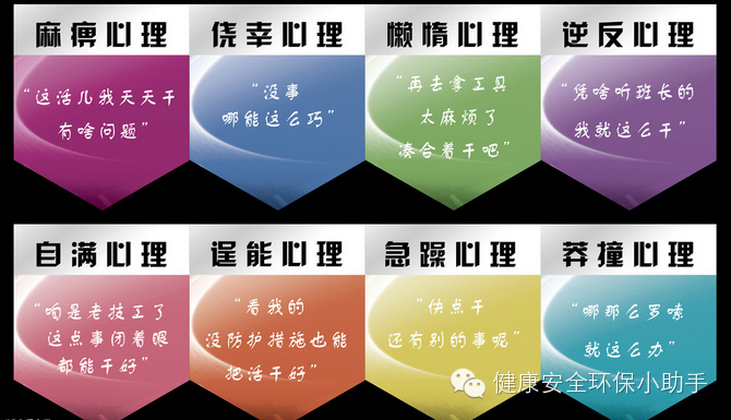 / U; d# F3 W3 C# A/ Y& N/ f) W1马虎心理--说的比做得好办事不认真、粗枝大叶,麻痹大意,学习浅尝辄止,做事丢三落四。在领导层身上一般表现为:对安全生产漠不关心,挂在“口头”,不想和安全有关系。 2侥幸心理--富贵险中求偶然获得成功或意外免去不幸,就觉得违章作业、闯红灯等违章行为未必会出事故,将赌博心理放在首位。 3逆反心理--谁抓安全生产,谁“倒霉”对上级领导不满意、闹别扭,或是认为“标准”与“措施”太繁琐、束缚人,从而产生抵触情绪。抓好安全生产对“升职”意义不大。 4莽撞心理--我想咋干就咋干言语行动草率不审慎,有关事项还没弄清楚就冒险蛮干,不顾国家法律法规、企业规章制度、原理规则,随心所欲。 5投机心理--事故都是天灾爱耍小聪明,喜欢投机取巧,但往往弄巧成拙。在安全生产方面“喜欢拆东墙补西墙”,大事化小,小事化了。 6自满心理--安全生产一抓就“灵”骄傲自满,固步自封,听不进不同意见,低估工作中的困难和问题。认为抓好安全生产就是“严防死守”,不学习且自以为是。 7浮躁心理--安全生产没有灵丹妙药心态不平衡,不按科学程序办事。觉得安全生产不确定因素太多,想抓好不可能。 8懒散心理--事不关己高高挂起懒惰、不自检束,自由散漫。安全检查“走马观花”,高高在上,不肯深入基层。 9疲惫心理--抓好安全生产太没“劲”了过度劳累或受某种刺激,处于压抑状态,思想不集中,反应迟钝。长期不出事故,麻痹思想严重。 10盲从心理--百般无奈,随波逐流办事没主见,人云亦云。别人怎么抓安全生产我就怎么抓,不管合不合适本企业文化;或者,领导怎么说,我就怎么做。 来源:河北安全生产微安全