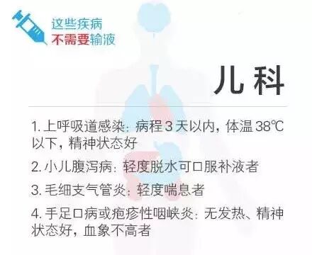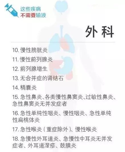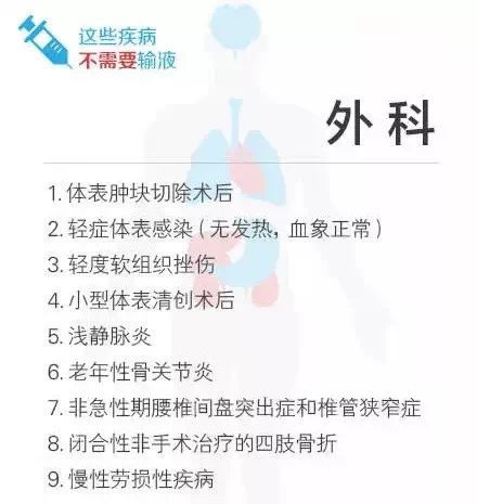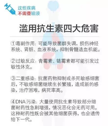 3 N! t8 I& D! U: ?% {[size=1em]卫计委公布了"53种不需要输液”的疾病清单",其中包括常见病多发病,一些外科、妇科炎症以及小儿的疾病,都明确可以不需要使用抗生素输液。有些“发炎”不是细菌感染,使用抗生素无效反而会导致滥用。 " A: s) P% v" H) ~