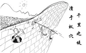 $ \3 p) M: M$ _$ \# O& J3 Y 故事:一个村庄为了防止水患,筑起了长堤。一天,有个老农发现蚂蚁窝一下子猛增了许多。老农担心蚂蚁窝会影响长堤的安全想回村报告,路上遇见了他的儿子,他儿子不以为然。当天晚上风雨交加,河水暴涨。河水从蚂蚁窝始而渗透,继而喷射,最终长堤决口,淹没了沿岸的大片村庄。 道理:小事不慎,将酿大祸。安全生产同样如此,有时候忘戴一次安全帽,少拧一个小螺丝,都可能酿成大的事故。所以,凡事要从大处着眼,小处入手,不能放过任何一个细节。当发现不安全的隐患后,必须迅速进行整改,避免问题积累,浅水沟里翻船。《斑鸠筑巢》——预防为主,永远不能忘
