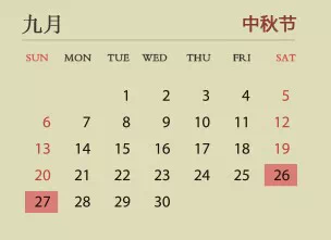 # J M) n/ p# M# e 9月26、27日为中秋节假期——怎么只有两天,我们的假期少了一天吗?其实没有少,继续往下看↓↓↓