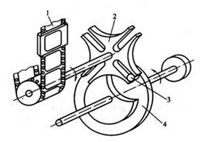 # l9 C w7 R9 Q. t1-胶片 2-槽轮 3-柱销 4-拨盘 0 W" {6 E% b$ U9 u( G7 s