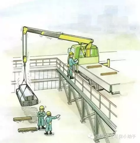 9 H8 E" C: Z' b( x4 S: F) X作业情况八:正用起重机卸钢材。 【有什么样的危险】 1 . 用两根钢丝绳起吊,钢筋在起吊过程中易滑落。 2 . 钢筋材料发生摇晃,滑落砸伤下方接货的作业人员。 3 . 信号指挥员距离卸货平台太近,吊件落下导致信号指挥人员受伤。 4 . 没有信号指挥人员。 【安全对策、事前处理】 1 .使用U形钩,同时使用四根同样长度的钢丝绳吊运。 2 . 钢筋起吊时,作业人员要离开卸货平台。 3 . 信号指挥员要远离卡车一定距离。 . l" Y/ L1 k7 R- W' {' R