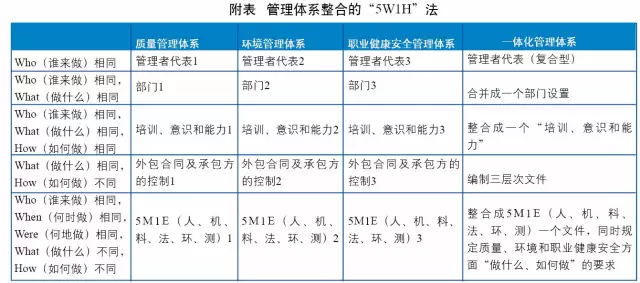 进行一体化管理体系的整合,需要充分运用“5W1H”的方法,即Who(谁来做),When(何时做),Where(何地做),How(如何做),What(做什么),Why(为何做)。对于独立的管理体系条款,当5W1H中的一个相同、两个相同、三个相同、全部相同时,即可进行整合,如附表所示。5 m" f( m/ W6 m; ^: l3 Q! U