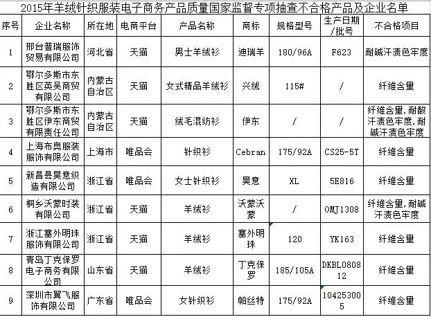 - 抽查了天猫、京东商城、苏宁易购、当当网、凡客诚品、唯品会6家电商平台企业销售的126批次服装产品,涉及111家生产企业,包括羊绒针织衫、休闲服装(机织)、床上用品;