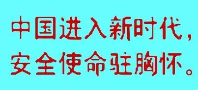 7 中国进入新时代,安全使命驻胸怀。 8 不忘初心谋发展,牢记使命保安全。 9 坚持人民为中心,应知危险离谁近。 10 民族复兴在路上,安全工作在现场。 11 平安中国大家建,齐心协力必实现。 12 科技强国是方向,安全前行靠保障。 ! g/ X- M! k8 v1 N& U. Y- F
